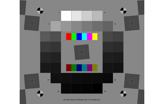 Nó cũng chứa các cạnh nghiêng ở trung tâm và các góc với độ tương phản 4: 1 để đo MTF. Các cạnh có MTF50> = 16 chu kỳ / mm, tốt hơn khoảng 3 lần so với các biểu đồ in phun tốt nhất. Dấu đăng ký làm cho các khu vực dễ dàng để lựa chọn. Nền màu xám trung tính giúp đảm bảo rằng biểu đồ sẽ được phơi sáng tốt trong máy ảnh phơi sáng tự động (so với biểu đồ có nền màu đen, đôi khi bị phơi sáng quá mức).